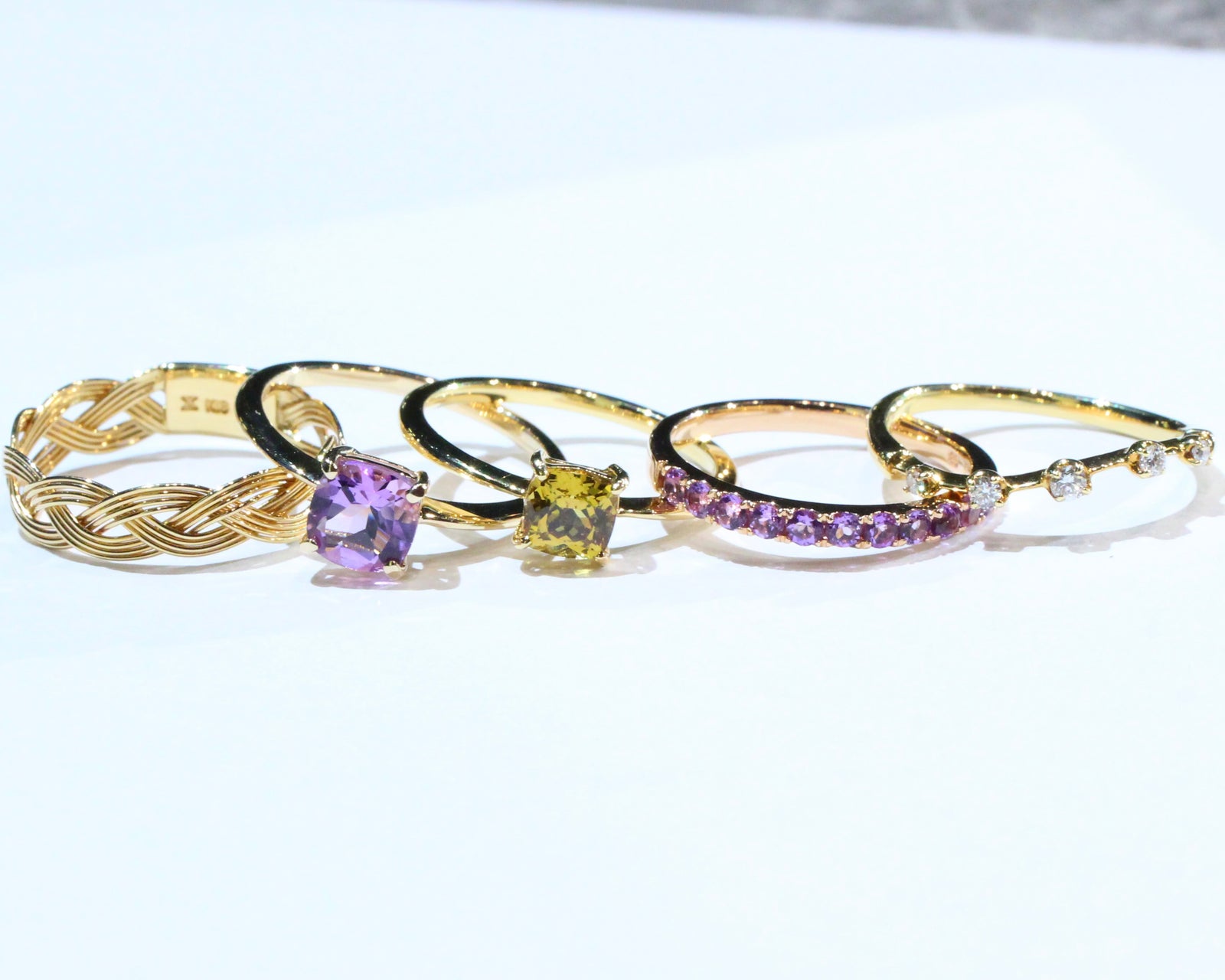 アクセントにゴールデンイエローのマリガーネットを入れると、お互いを引き立て合う存在になり、カラーストーンを楽しむ幅が広がりますね!
